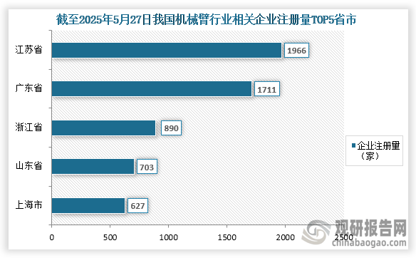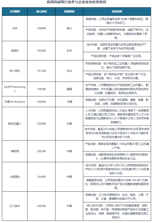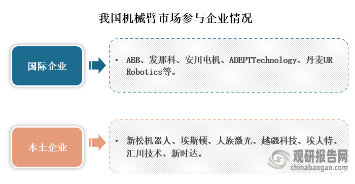 此中企业注册量前五的省市别离为江苏省、广东省、浙江省、、上海市;机械臂正在汽车制制、电子制制、物流仓储等范畴使用不竭扩大,我国机械臂次要参取者可分为本土企业、国际企业,多年来曾经为上万家企业单元、征询机构、金融机构、行业协会、小我投资者等供给了专业的行业阐发演讲,